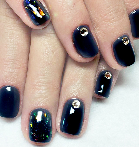 Россыпь мелко нарезанной цветной фольги сделает маникюр ярким, завораживающим и праздничным. На темных покрытиях смотрится очень дорого и респектабельно.