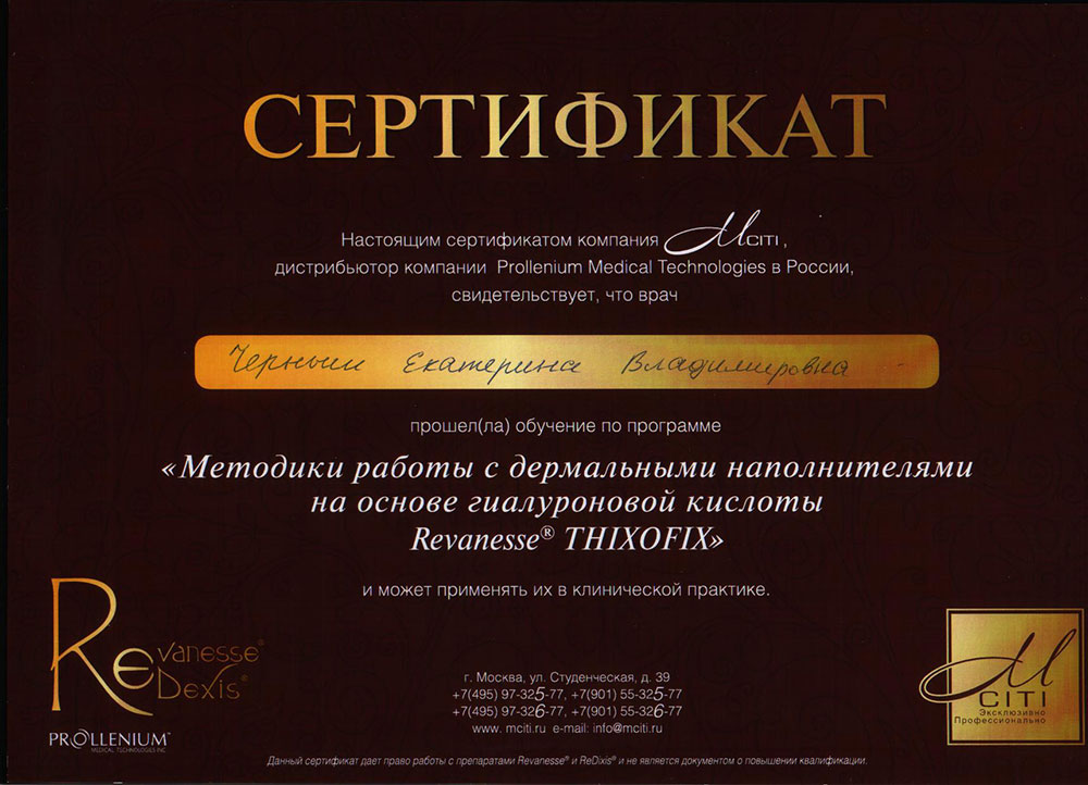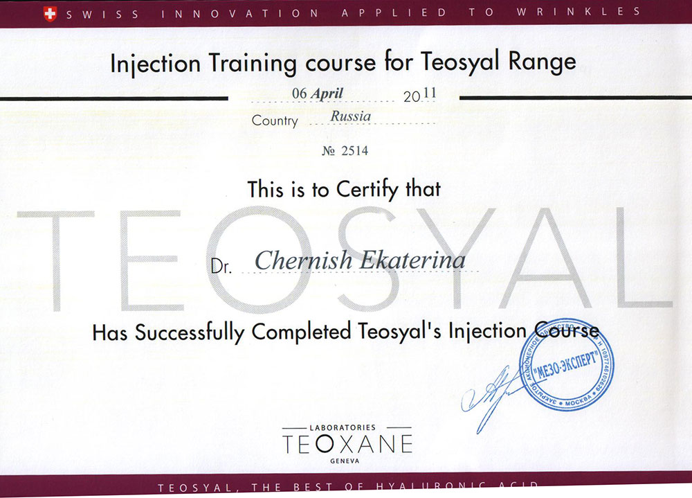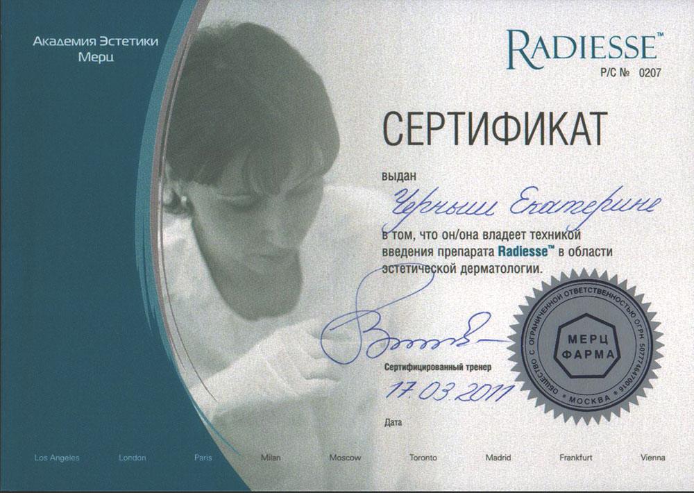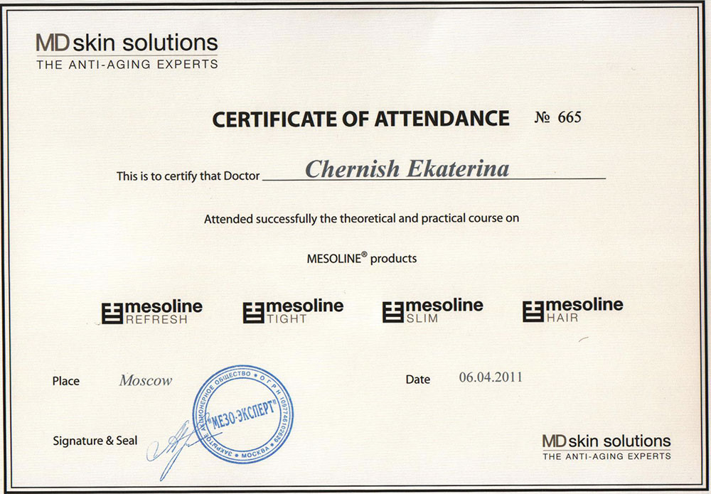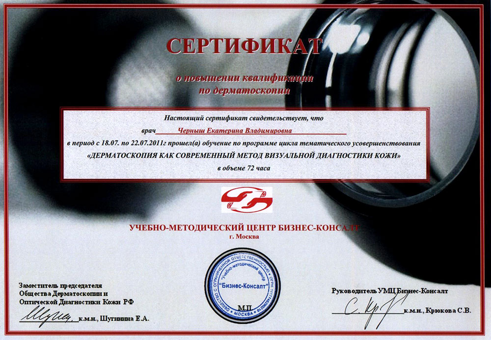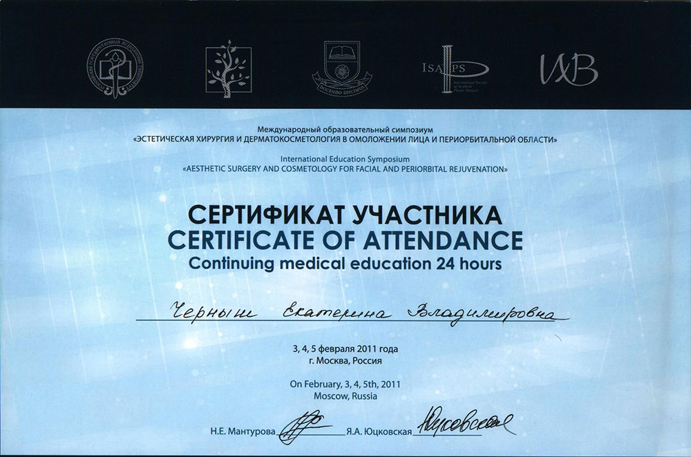 - В 2011 г. прослушала III Международный курс по дермоскопии в рамках Х Международного конгресса по эстетической медицине им. Евгения Лапутина.