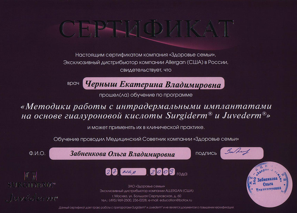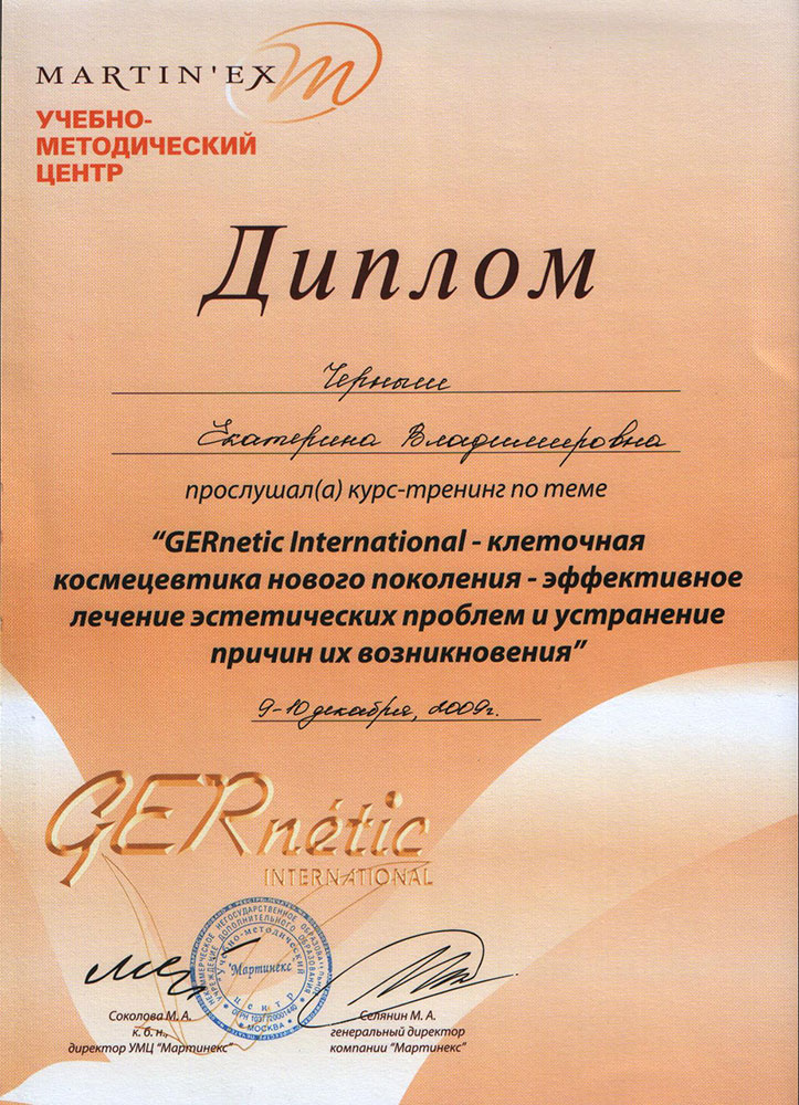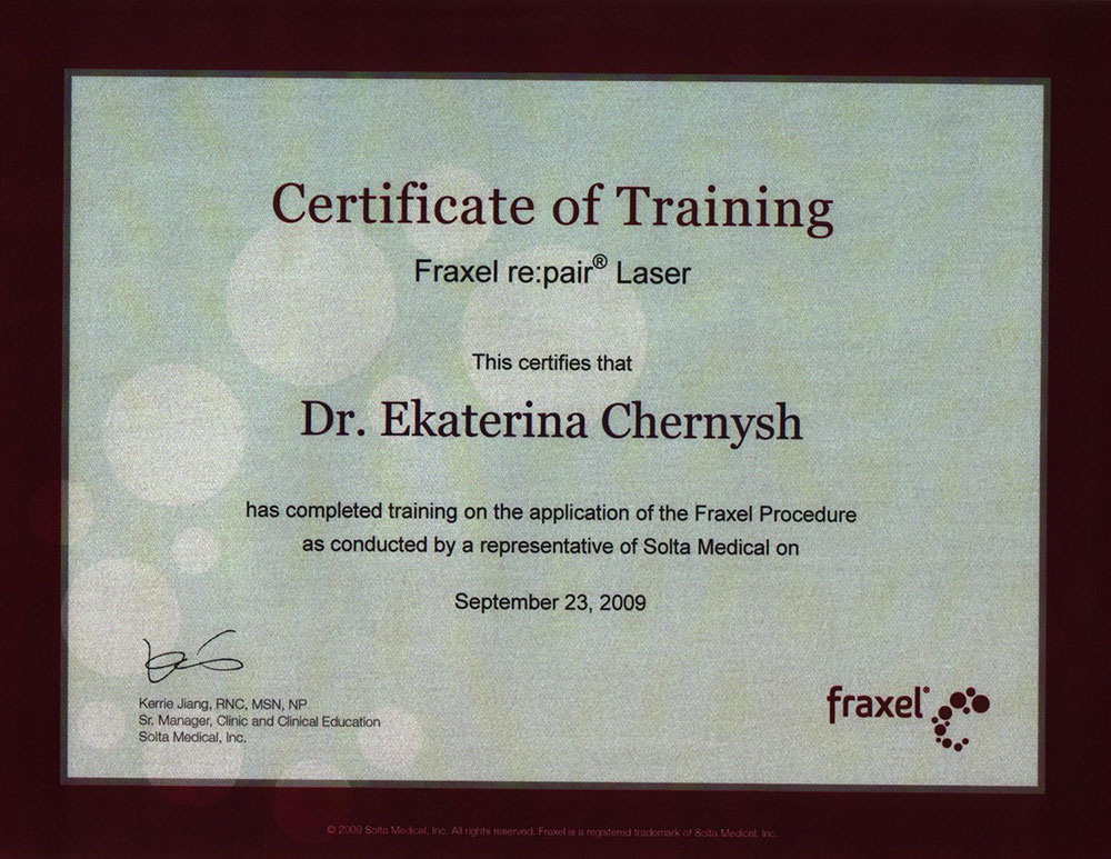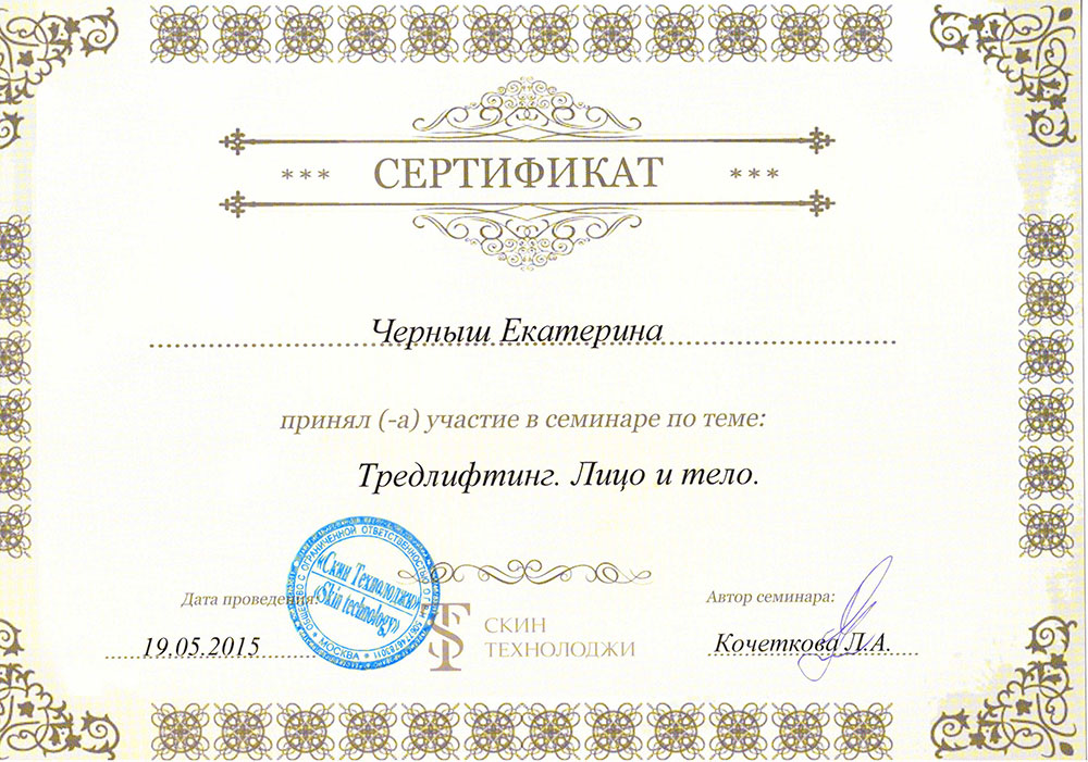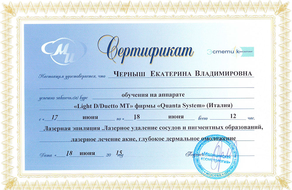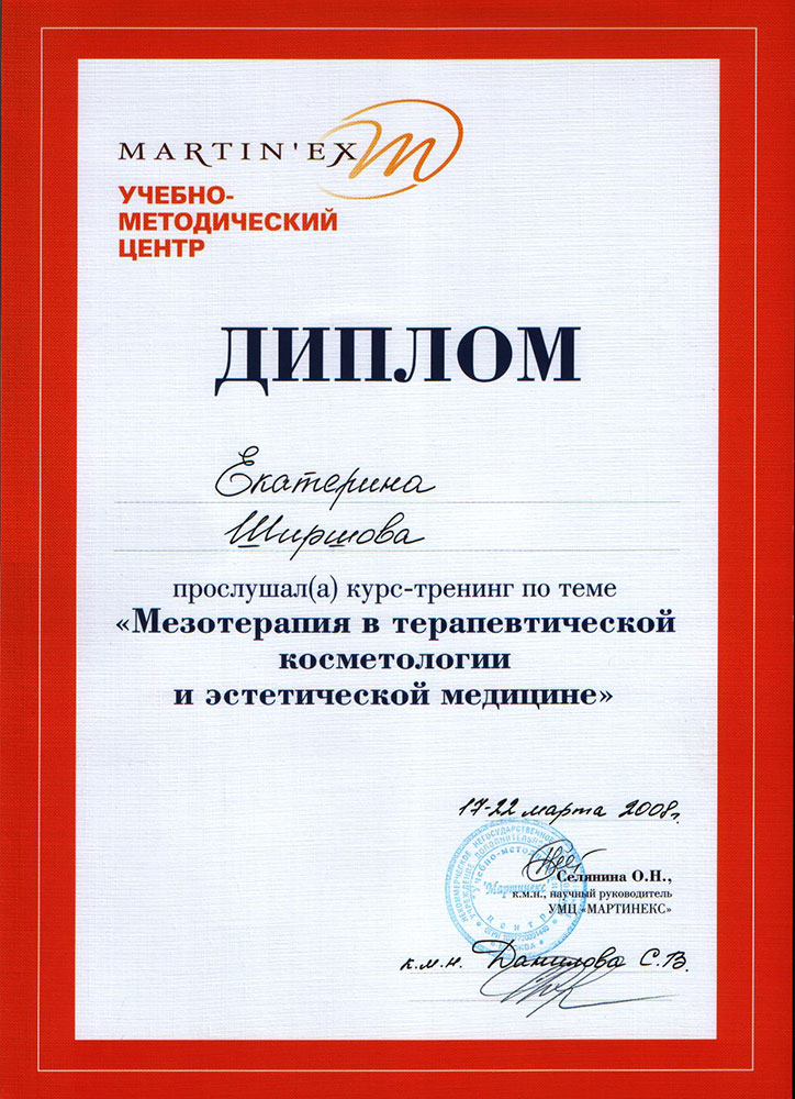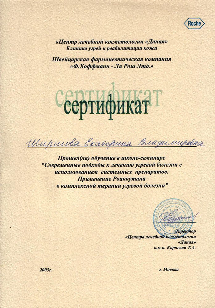 - В 2003 г. прошла обучение в школе-ссеминаре «Современные подходы к лечению угревой болезни с использованием системных препаратов. Применение Роаккутана в комплексной терапии угревой болезни». «Центр лечебной косметологии «Даная», фирма Хоффманн ля Рош (Швецария).