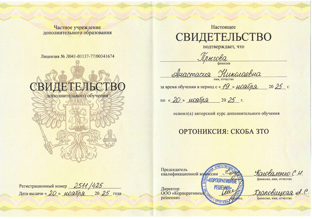 В 2011 г. прошла курс повышения квалификации по программе «Инновационная методика коррекции вросшего ногтя «Подофикс» на базе Учебного центра «SUDA».