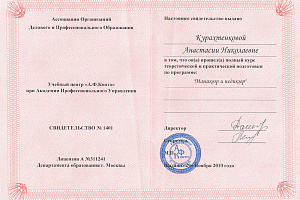 В 2010 г. окончила курсы по программе «Маникюр и педикюр» на базе Учебного центра «А.Ф. Конто».