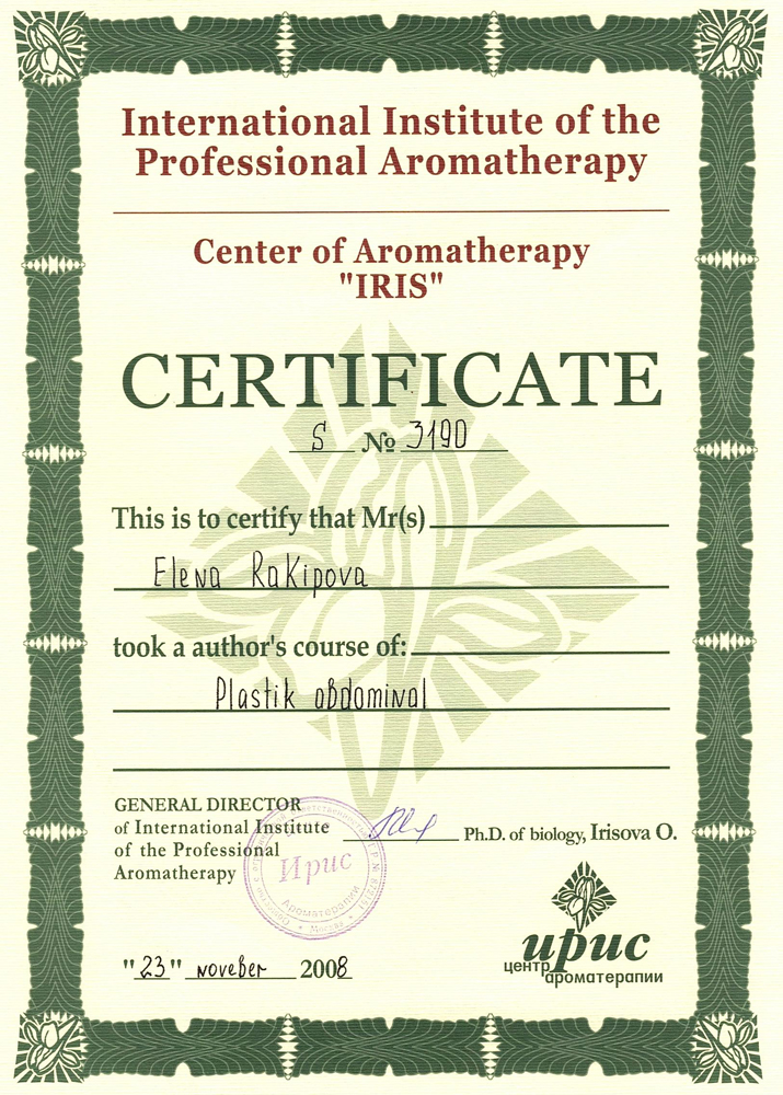 В 2008 г. прошла профессиональную переподготовку по специальности «Абдоминальная пластика» на базе Международного Института Профессиональной ароматерапии.
